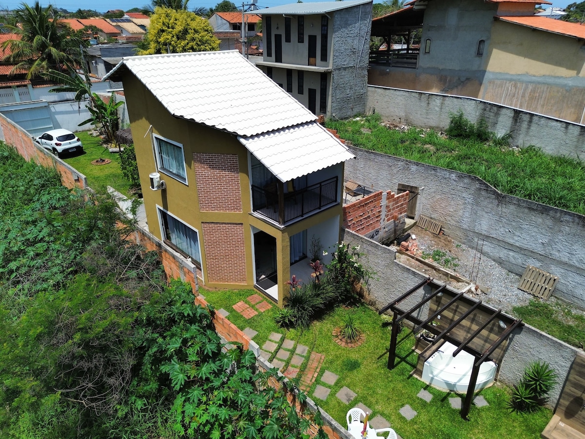 Casa com 2 andares, garagem , portão eletrônico. No primeiro cozinha e sala, segundo andar uma suíte com uma linda paisagem da Serra da Tiririca, hidromassagem aquecida ao ar livre, área gourmet com fogão a lenha, churrasqueira e Lavabo, pergolado com fogueira, Ideal para casais a procura de um local para relaxar e curtir momentos românticos. Pertinho temos o centrinho comercial onde encontramos mercados, bancos, padarias e restaurantes. Localizado a 5 minutos da praia de recanto de Itaipuaçu.