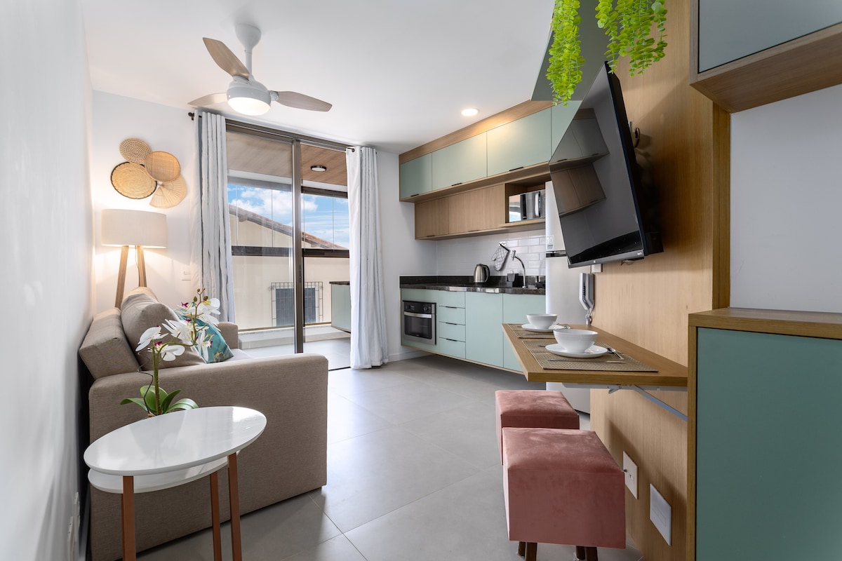 Amplo loft. Varanda com churrasqueira e vista pro mar. Sol da manhã. Bem equipado (cafeteira espresso, cooktop 01 boca - indução), liquidificador, filtro água, microondas, torradeira, máquina de gelo). 01 cama de casal e 01 sofá-cama.