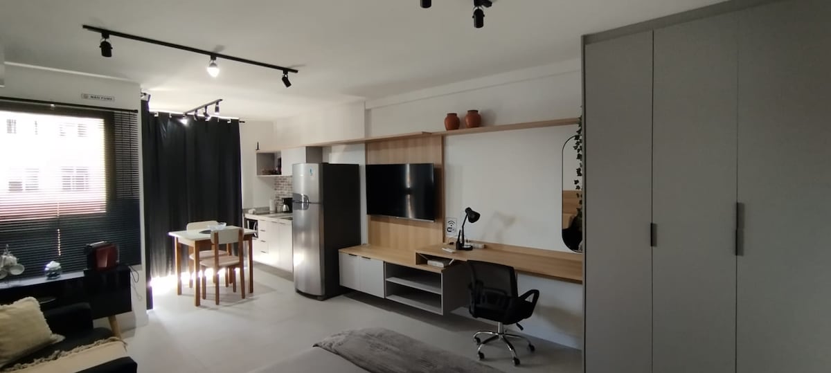 The stylishly decorated loft features an open concept with a wooden divider separating the bedroom from the living room and kitchen. It has 2 TVs, one in the bedroom and one in the living room. With a comfortable double bed, many windows bringing in natural light, a kitchen integrated with the living area, and a spacious L-shaped balcony with a surreal view of Icaraí Beach. Fully equipped, it's 200m from the beach, close to pharmacies, a market, restaurants, and the most famous street in Icaraí.