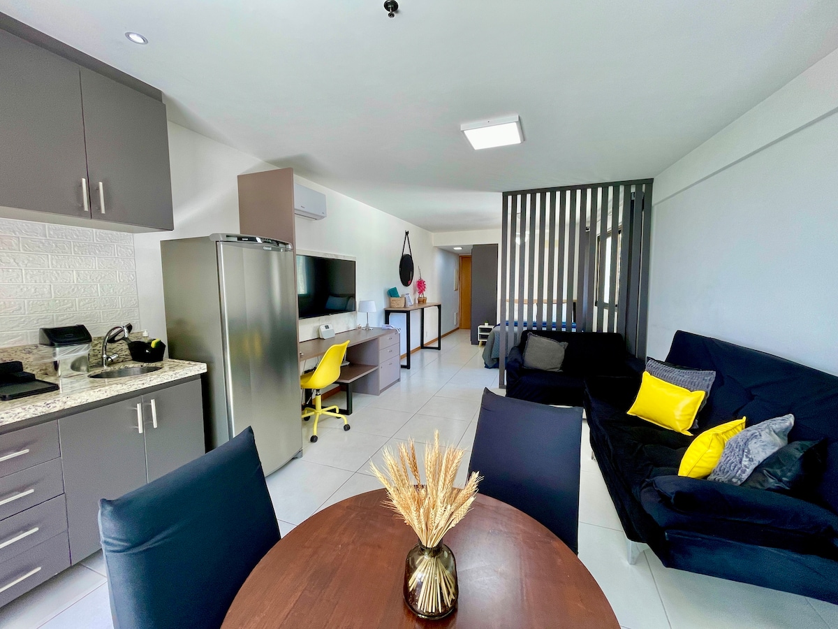 The stylishly decorated loft features an open concept with a wooden divider separating the bedroom from the living room and kitchen. It has 2 TVs, one in the bedroom and one in the living room. With a comfortable double bed, many windows bringing in natural light, a kitchen integrated with the living area, and a spacious L-shaped balcony with a surreal view of Icaraí Beach. Fully equipped, it's 200m from the beach, close to pharmacies, a market, restaurants, and the most famous street in Icaraí.