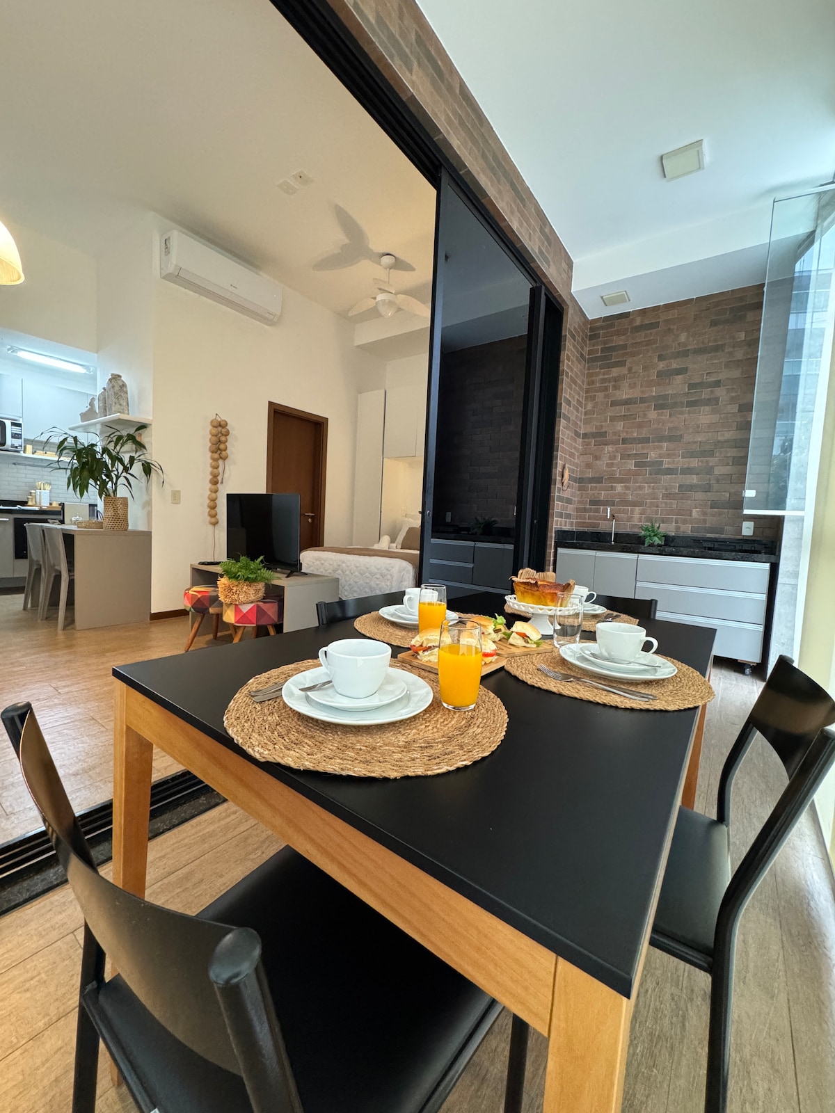 The stylishly decorated loft features an open concept with a wooden divider separating the bedroom from the living room and kitchen. It has 2 TVs, one in the bedroom and one in the living room. With a comfortable double bed, many windows bringing in natural light, a kitchen integrated with the living area, and a spacious L-shaped balcony with a surreal view of Icaraí Beach. Fully equipped, it's 200m from the beach, close to pharmacies, a market, restaurants, and the most famous street in Icaraí.