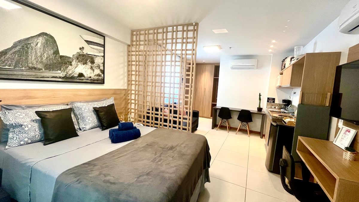 The stylishly decorated loft features an open concept with a wooden divider separating the bedroom from the living room and kitchen. It has 2 TVs, one in the bedroom and one in the living room. With a comfortable double bed, many windows bringing in natural light, a kitchen integrated with the living area, and a spacious L-shaped balcony with a surreal view of Icaraí Beach. Fully equipped, it's 200m from the beach, close to pharmacies, a market, restaurants, and the most famous street in Icaraí.