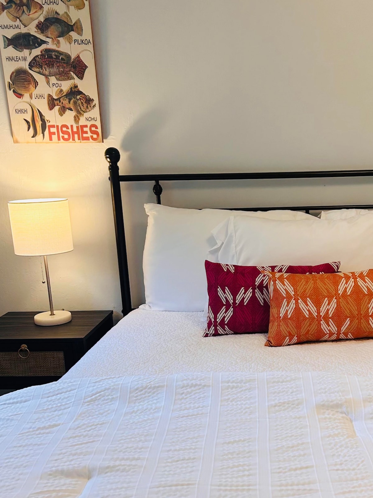The guest suite is accessed via a private entrance. The kitchen is fully equipped and has a bay window dining area. Step through the double French doors and relax on the 34 feet veranda with views of the ocean and Maui. The living room is furnished with heirloom heritage koa furniture and a pune’e (day bed) for lounging. The bedroom is appointed with a luxury Stearns & Foster pillow top queen bed and accented with Hawaiian design quilted pillows. Need internet connectivity? Sit at the Tommy Bahama desk in the study and connect to the free wi-fi or hard wire. 50” flat screen TV. Full range 2.1 speaker system to plug into your smartphone or music source. Choice Hawaiian CDs are available for your listening pleasure as are a cooler, beach towels, mats and sand chairs for your beach outings.