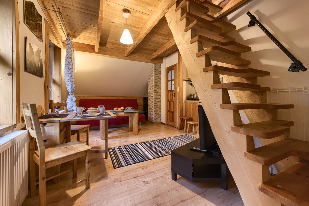 Wakacje w luksusowych warunkach? Oczywiście! Dwupoziomowy apartament z antresolą pełniącą funkcję sypialni spełni te wymagania. Usytuowany na pierwszym piętrze Tater Chaty, posiada osobną łazienkę z podgrzewaną podłogą i w pełni wyposażony aneks.