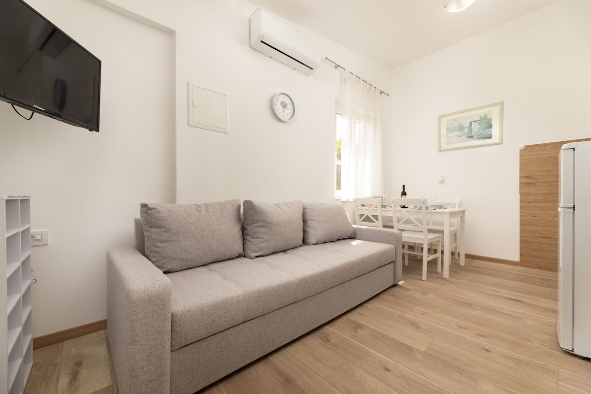 Apartment is nice and cozy. Surrounded by flower gardens apartment gives you pleasant atmosphere during hot summer period. Seaside is only 400 meters away and you can find beaches from sandy to stone and from crowded to solitary. Neighbourhood is nice and calm and you can be assured that your vacation will be relaxing and comfortable.