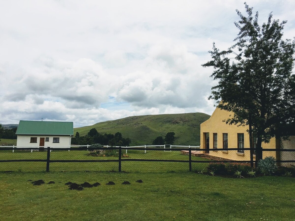 Relax & enjoy the peaceful surroundings of our unique farmhouse situated on 2000ha of land/working farm and surrounded by mountains. Enjoy the many hiking/mountain-biking trails, fishing in the lake, game viewing, hiking to the waterfall & the breathtaking sunsets. Sit by the crackling open fire in the covered boma and admire the sparkling night sky. *An extra chalet with 4beds, en-suite & kitchenette can be booked on request for an additional R550 per night. STRICTLY NO DOGS ALLOWED