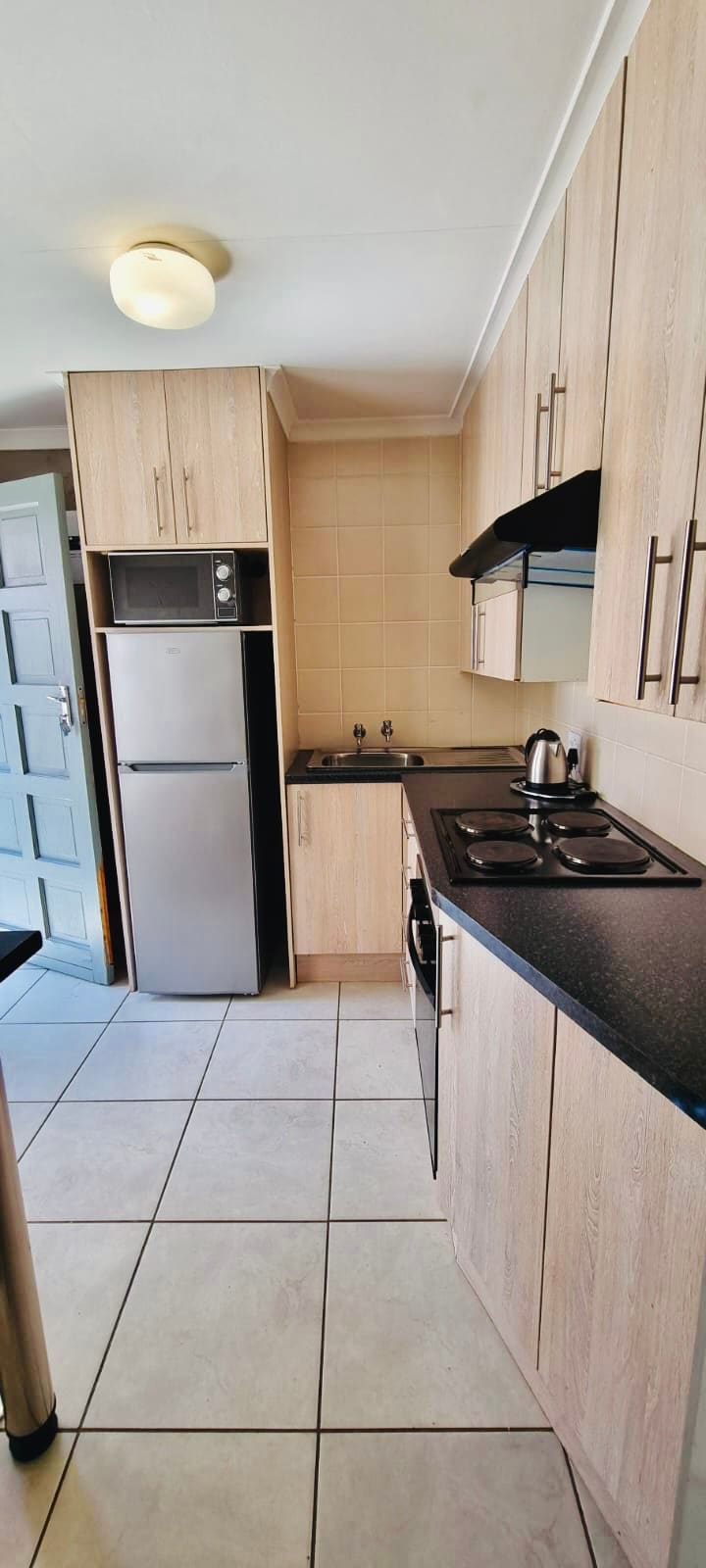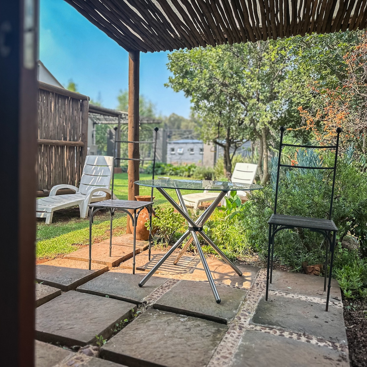 This spacious Studio apartment with basic facilities, Kettle, Microwave and TV with selected Open-View channels, and communal kitchen. A private Patio with Braai facilities and stunning views.