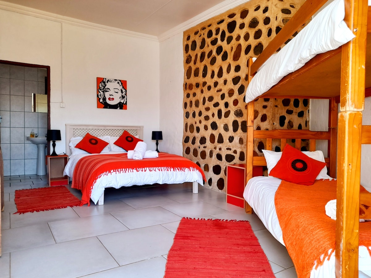 Cama7 is suited to accommodate 3 guests and is equipped with a double bed and a single bed, an en-suite bathroom fitted with a shower, toilet and basin, tea- and coffee-making facilities and access to a communal kitchen. Included is a TV with selected OpenView channels and a braai area.