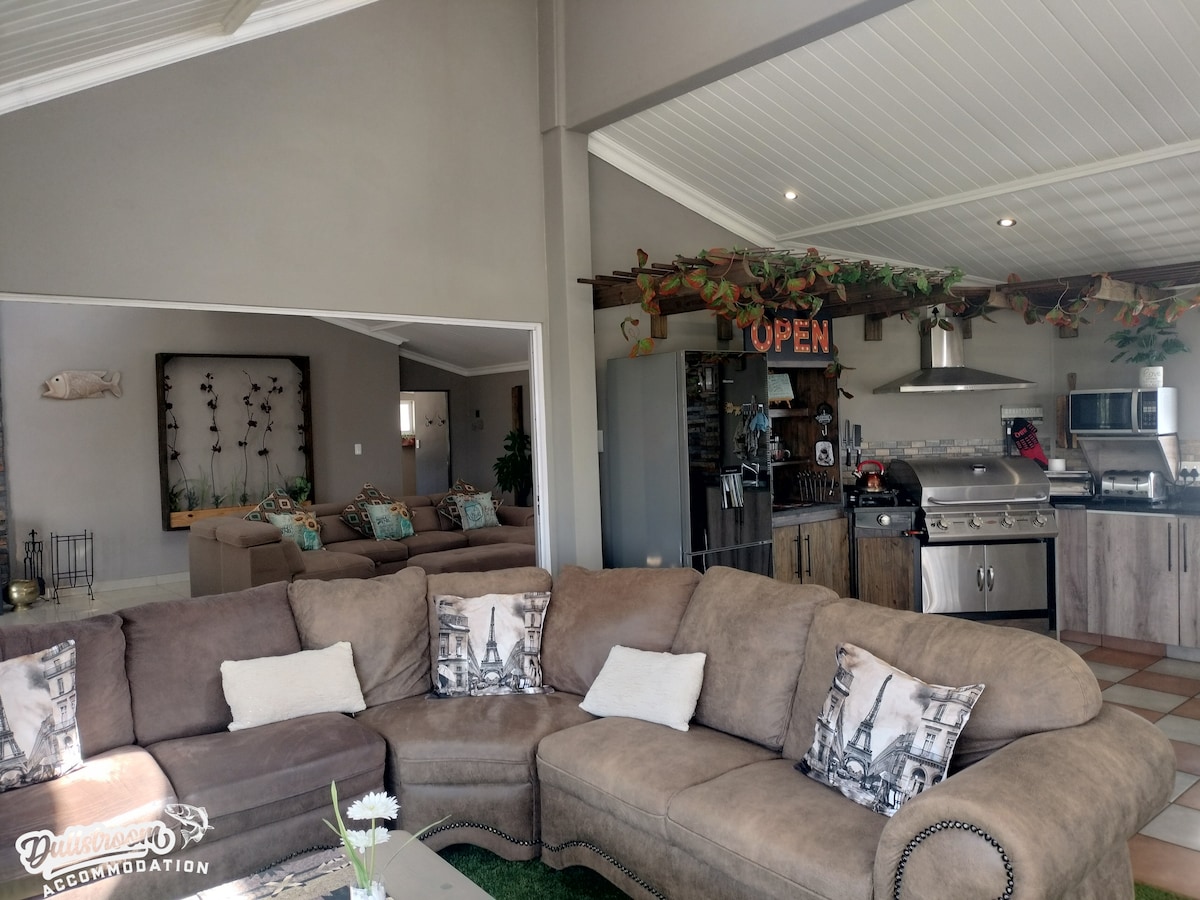The house is centrally located and is within easy walking distance to the main attractions. It has its own fenced off garden and is situated in a small estate with 3 other houses. There's a solar system which keeps lights, wifi and the fridge on during loadshedding! The main living area is spacious and has a beautiful sunroom for lounging around. Each bedroom can be arranged into either double or single beds which is ideal for any group booking and there is a pizza oven available as well.