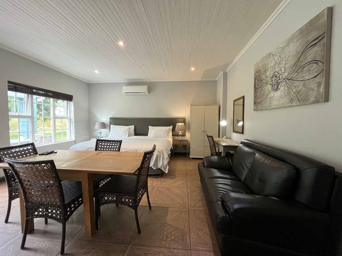 The Mozambique guest suite is located in a farming community situated 5km out of town. It comprises of a fully furnished, air conditioned unit with free Wi-Fi. The unit has a queen bed, open plan kitchenette, living area and private bathroom. The unit is best suited for short-term stays. The entrance and parking are shared with the main house, with private access to the unit. The neighbourhood is quiet and secure. Laundry services and housekeeping can be arranged at an additional cost.