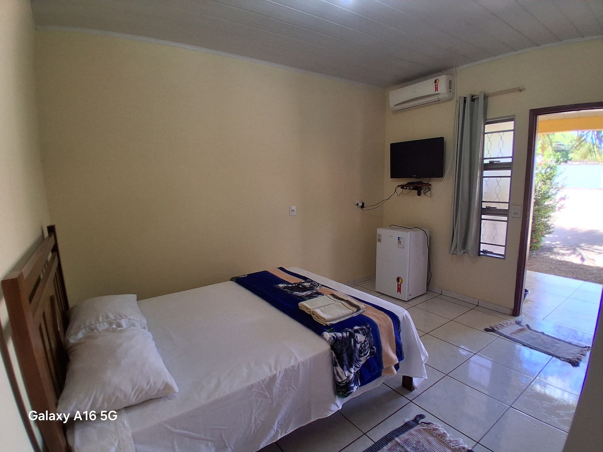 Chalé privativo, compacto e funcional na Vila de Bom Jardim, em Nobres/MT. Conta com ar-condicionado, TV Smart, Wi-Fi de qualidade, cozinha equipada e churrasqueira de alvenaria com iluminação. Ideal para quem busca conforto e autonomia após explorar os atrativos naturais da região. A poucos minutos de flutuações, cachoeiras e da Lagoa das Araras. Perfeito para casais ou viajantes solo.