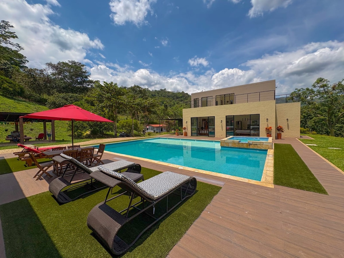 Welcome to our spectacular luxury estate between La Vega and Villeta. Surrounded by mountains, a river and exuberant vegetation. It has a swimming pool, jacuzzi, sauna, kiosk/entertainment room, two kitchens and two grills. Three bedrooms, each with a private bathroom. Wide green spaces to sunbathe or relax. Warm climate just 45 minutes from Bogotá. Perfect for family vacations or meetings with friends. Live the experience of staying in one of the best properties near Bogota at La Vega!