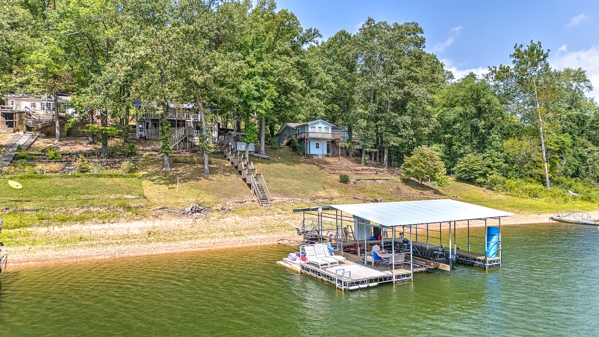 Fully equipped lakefront cabin has a basement level master with a king bed, closet & tv with access to the covered patio on the basement level. The 2nd bedroom has a king & double bed, closet, and tv. These bedrooms share a full bath with shower. The main living is an upstairs area and is an open room with a comfortable living space, kitchen, bar & table, and laundry closet. A ladder takes you to the loft where there is a full bed. This area would not be good for small children. No hot tub