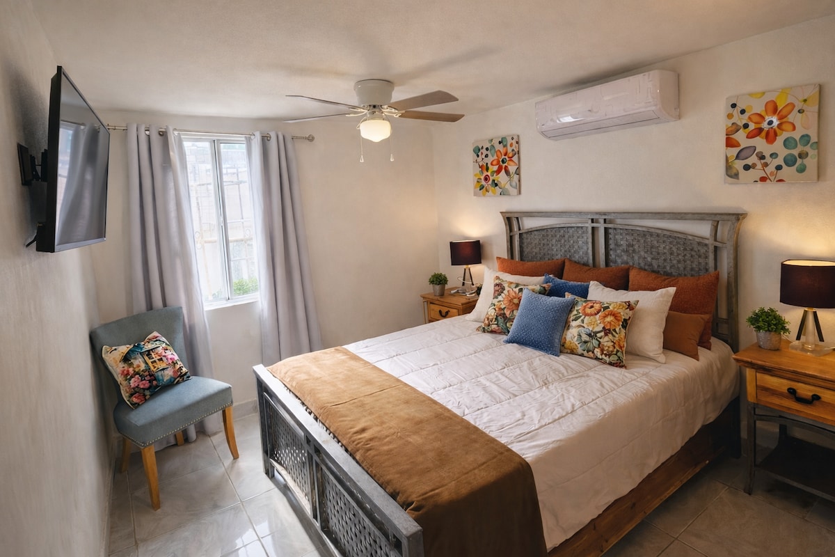 Departamento — Ideal para trámites de visa. En auto, a 3 min del CAS y 15 min del Consulado de EUA (Kalitea). Perfecto si vienes por tus citas de visa. 1 habitación, 1 cama queen size, colchón con memoria de forma, TV de 44" con Netflix, abanicos de techo y ropa de cama de calidad. Sala; 🛋️💤 Dos sofás-cama, uno para cada quien, para 2 huéspedes adicionales, con almohadas, sábanas y cobija incluidas, equipada con TV de 58" y Netflix. 🧼 Incluye: Toallas y productos básicos de higiene.