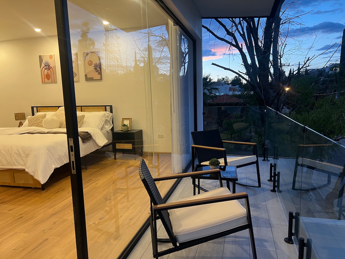 Bienvenido a este loft bohemio con terraza y hermosa vista, vive una experiencia única, un espacio lleno de encanto, luz natural, buena energía y acogedor para descansar, trabajar o disfrutar. Ubicado en el corazón de Nogales en la mejor zona de la cd, el lugar tiene una ubicación estratégica: ¡será muy fácil planear tu visita! Muy cerca de tiendas de autoservicio, farmacias, restaurantes, gimnasio, Podemos llegar caminando! Nos encontramos a escasos 2 minutos manejando del consulado americano.