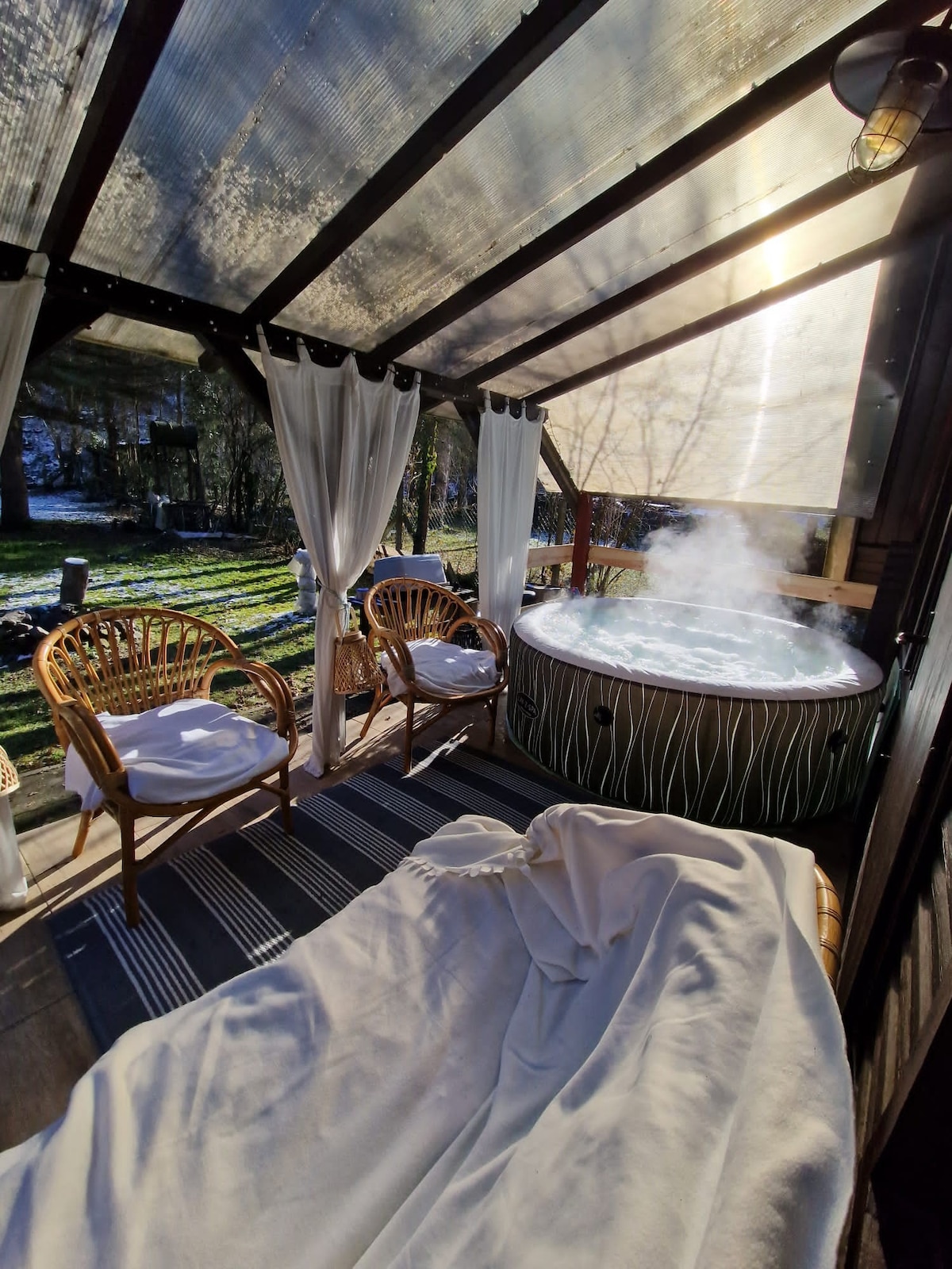 The two-storey house is located in a peaceful forest environment. On the lower level, there is a living room with a corner sofa set that can be opened and provides sleeping opportunities for two people. The living room opens to a fully equipped kitchen. Also on the ground floor is the bathroom, equipped with toilet and shower. In the garden we have a 30 m2 covered lounge, where a 6-person garden sofa set and a 5-person Wellis Budapest Premium Life jacuzzi try to serve our relaxation.