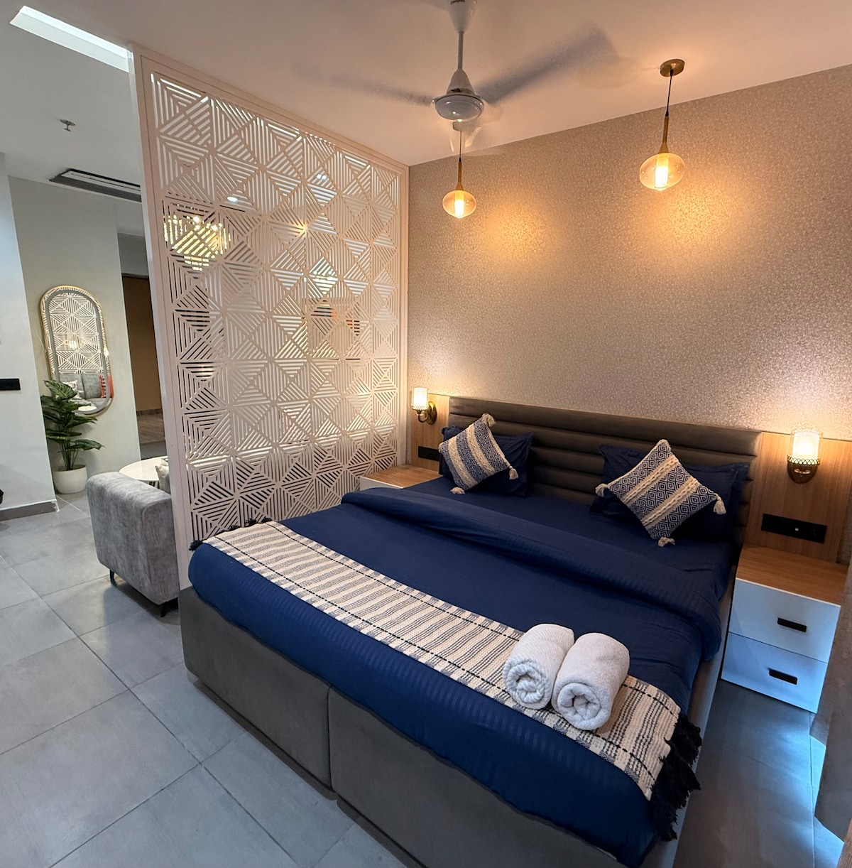 The first 2 Bhk Apartment that meets every requirements ✨ - 2 Bedrooms ( Master bedroom, second bedroom) - 2 King Sized Beds - A spacious living area with a comfortable seating arrangement - 2 bathrooms ( 1 in each of the bedrooms) - Kitchenette (with all cooking basics available and amenities stocked up, it is the perfect place to prepare your favourite meals) - A Shared Balcony area connecting with the apartment which can be the perfect space for your evening strolls Book Now!!