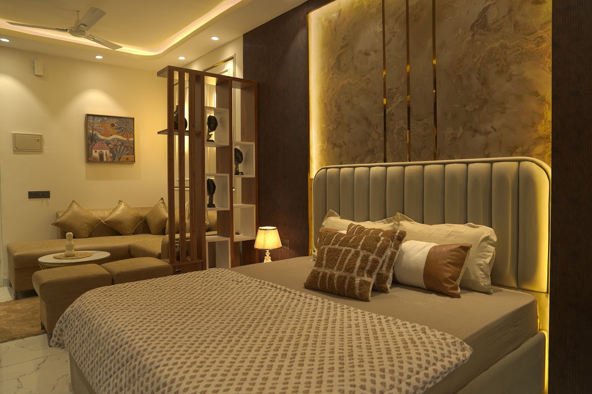 Experience a serene and stylish stay in the heart of Supernova, Noida. This beautifully designed boutique bedroom blends modern comfort with elegant tropical aesthetics. Featuring a plush king-size bed framed by soft sheer drapes, warm ambient lighting, and a designer accent wall, the space is perfect for relaxation after a long day. Wake up to stunning city views from the balcony and enjoy a calm, cozy atmosphere enhanced by premium furnishings.