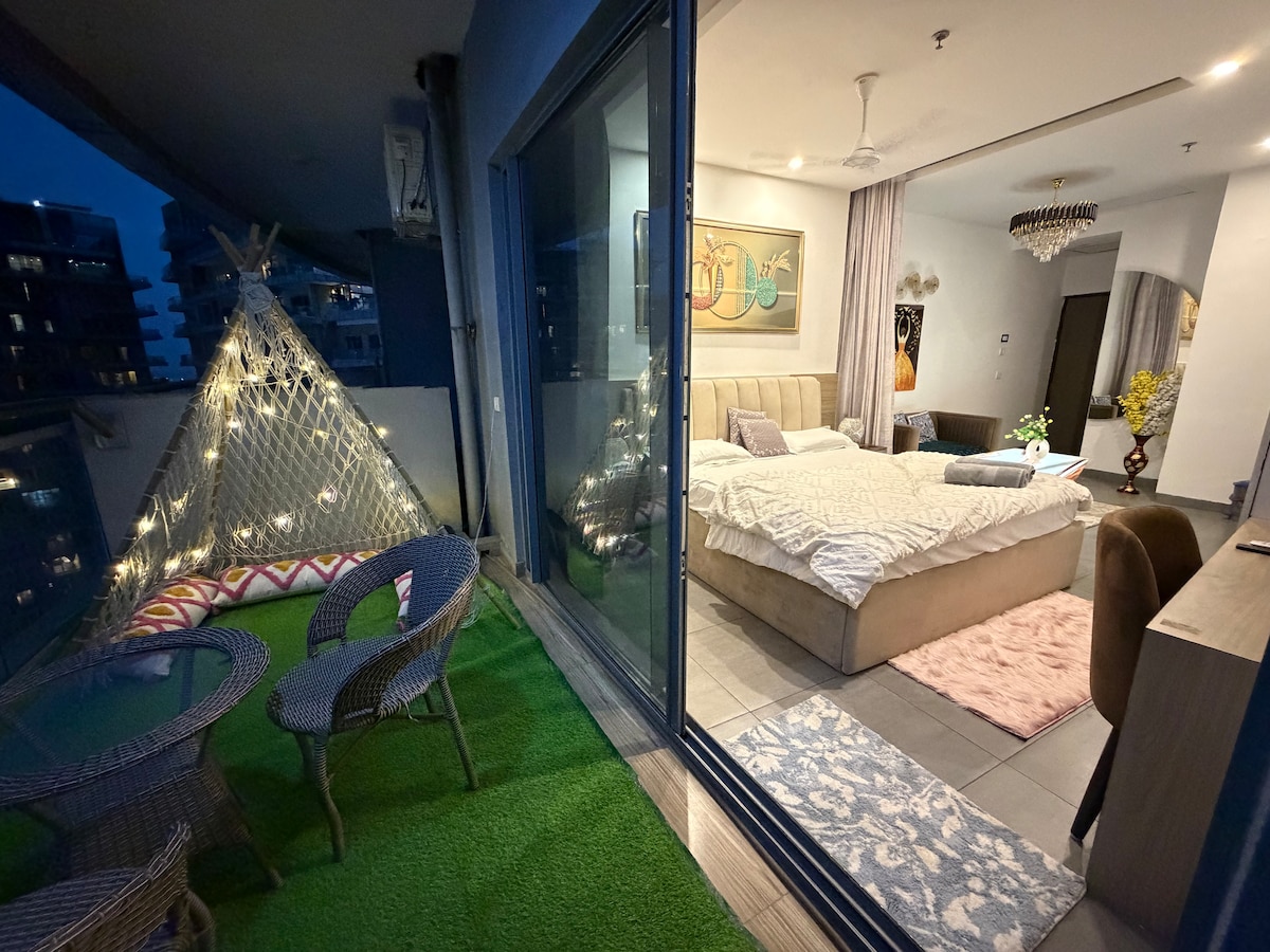BLUO STAYS - Award winning Homes! #Staycation #CoupleGoals Awesome Designer Penthouse with private Terrace Garden having al-fresco seating, Open Shower, Bar, TT & Gym! Private Home in Sector 45 Noida, 10 min to Great India Place & Gardens Galleria - King Bed, 55" Smart TV with SoundBar, Bathroom with BathTub, Couch, Dining Table & fully equipped Kitchen plus Barbeque & Bonfire. All-inclusive Daily Rental - WiFi Internet, Netflix, Cleaning, Washing Machine, Utilities, Parking, Power Backup..