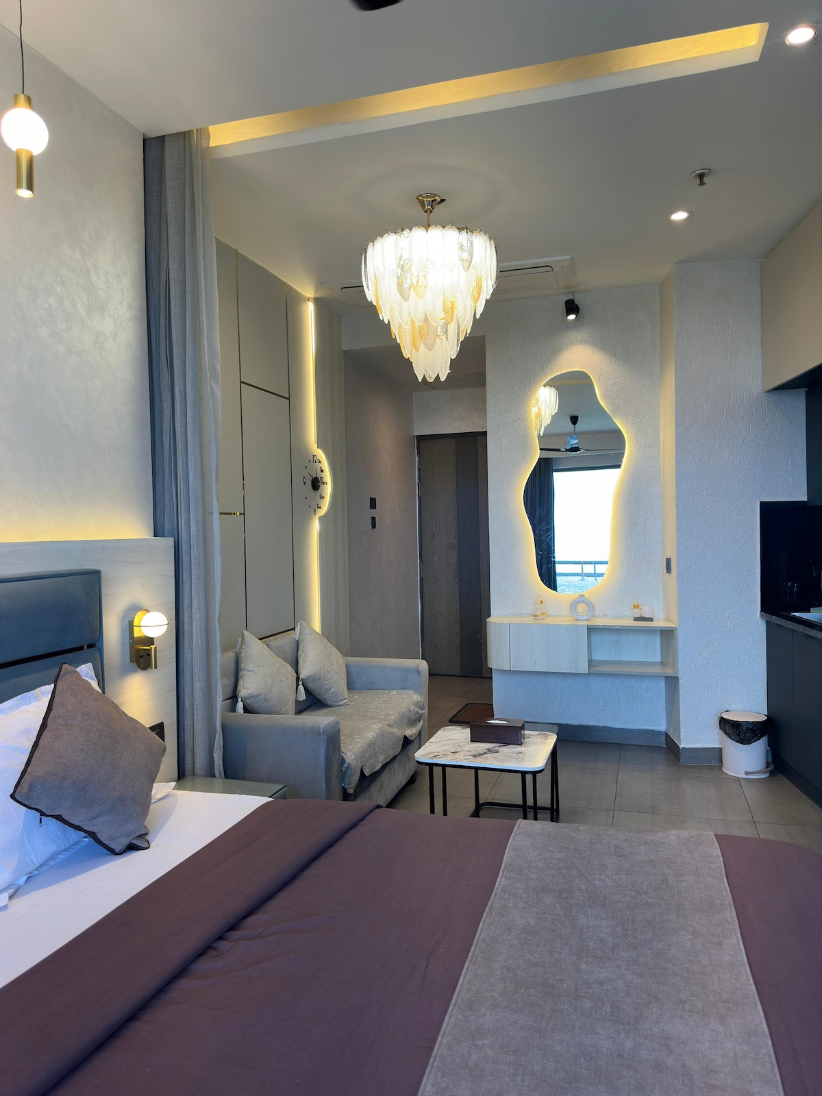 Introducing our exquisite luxury studio apartment: Nestled in the heart of the city, this opulent studio boasts modern elegance and unparalleled comfort. The open-concept design invites you into a spacious haven, bathed in natural light from the large windows that offer breathtaking city views. This apartment is on the 41st floor in one of the tallest sky scraper in Delhi - NCR. The apartment has a river facing view from the balcony!!