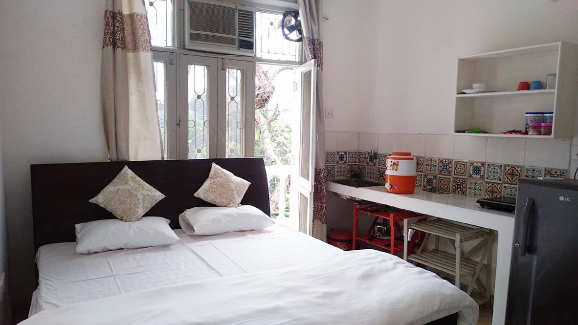 Our newly constructed 2 BHK apartment blends modern comfort with natural charm. The space features 2 serene bedroom with a queen-size beds, a spacious living room, a well equipped kitchen, 2 bathrooms: one attached to the master bedroom and another accessible from the living room and second bedroom and L- shaped balcony offering great view of the city. The property is located near a premium mall in Noida! This well-situated location offers you the convenience of shops, cafes, and entertainment.