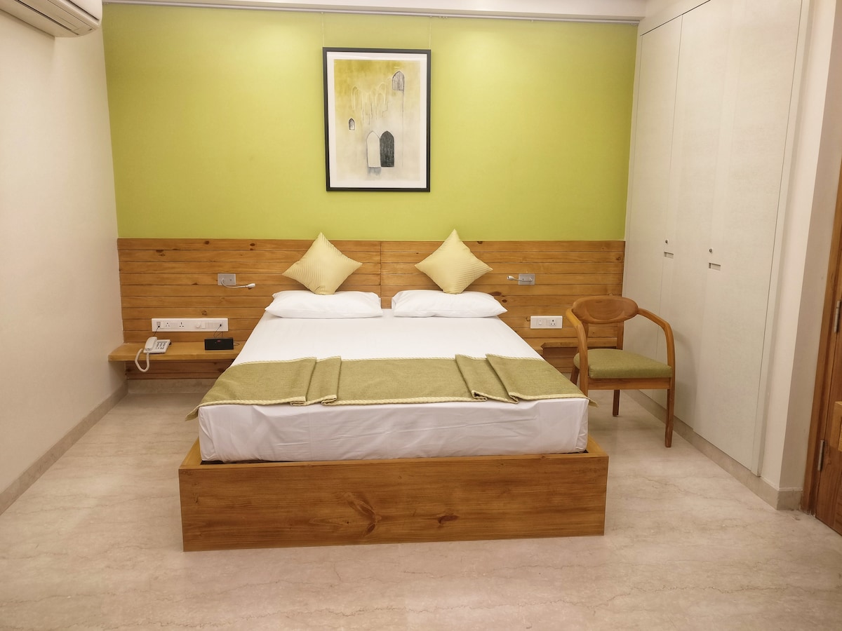 Best located aerial green view private room with attached bathroom & additional private glassroom which opens to terrace ..2 metro lines 500mts away. Room has designer wooden interiors . Floor bedding for guest @ extra Rs500. Room has indoor ambient mood lighting and TV/ wifi facility n open air garden terrace n studyroom. Room Cleaning & washing of clothes extra @ Rs 100 per day .Ac charges 400per day to be paid at time of Check-in on usage.