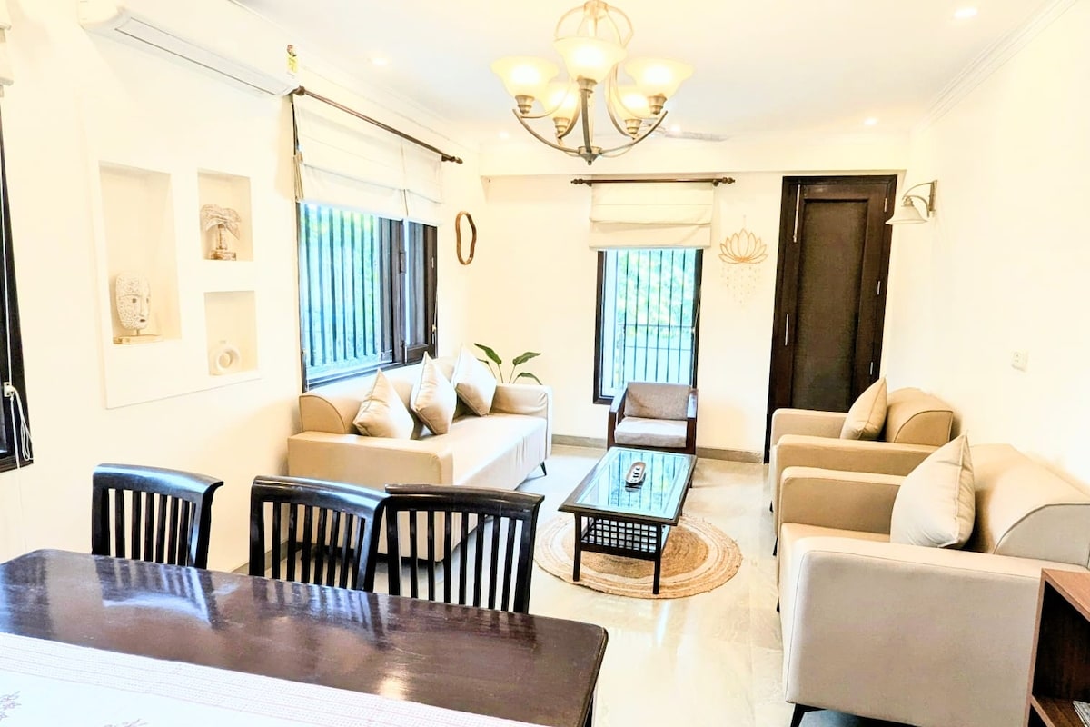 ★Centrally located with an expert chef to ensure a comfortable stay without the hassle of cooking. Complimentary breakfast. ★Entire 1st Floor. 2200 FT², 4 Bedrooms w Attached Bath. ★250 Mbps WI FI. SMART TVs. ★24 H Guard & Caretaker. ★5 Min Walk To Def Col Market Packed Full With Restaurants, Pubs & Cafe. 5 Min Walk To Metro. ★Modular Airconditioned Kitchen, RO Filter, AC, Heating, Washer. ★Daily Housekeeping. ★Airport 14 KM/Rs. 500. ★Close To India Gate, AIIMS. ★Working Office Table.