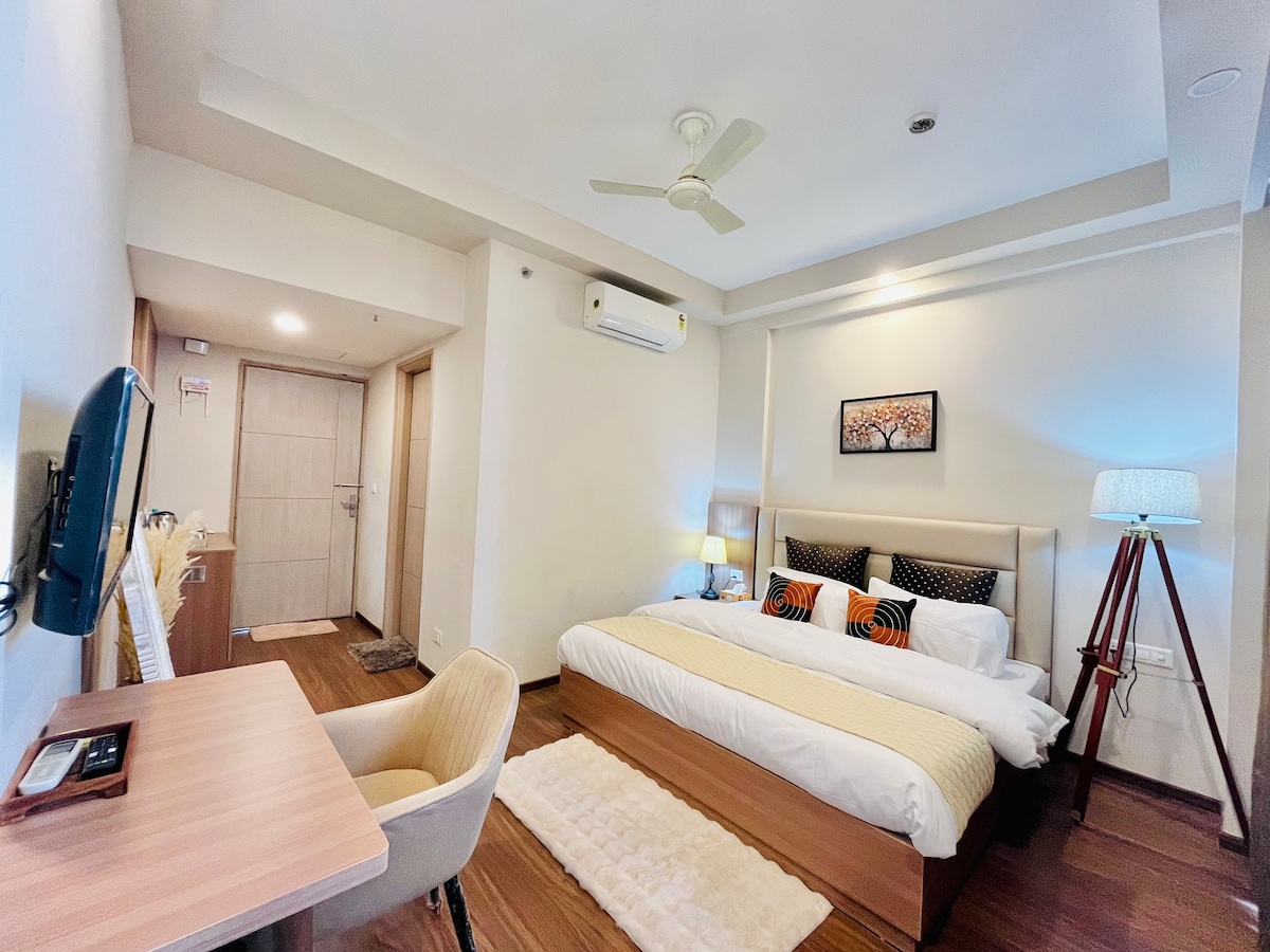 Kick back & relax in this calm & luxurious studio with the warmth of home & the vibe of a high-end hotel. Furnished with a plush Queen-size bed & modern décor. Amenities: 24/7 Grocery Store Modern Kitchenette High-Speed WiFi & TV Secure Parking outside tower but 24/7 Secured The first 2 floors has commercial shops, offering: Laundry Services Salon Café Medical Store Easy access to the India Expo Mart, Buddh International Circuit. Perfect for couples, solo travellers, or business partners.