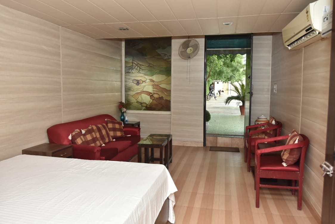 Enjoy the lush greens, open spaces, private courtyard, plunge pool, patio for a memorable vacation. There is adequate seating arrangements on the lawns as well as the open paved courtyard which offers privacy. A DIY barbeque is available within the premises alongside a kitchen with cookstove, microwave, refrigerator and cutlery. The living room has a polk audio music system which can be connected over bluetooth.