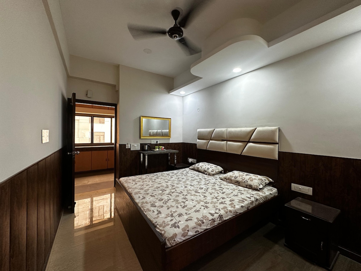 A tastefully furnished 3 room ( Bedroom + Living Room + Dining Room) self catering Villa with attached bath, a functional kitchen, an outdoor 2 sided wraparound patio and' an enclosed back courtyard, total 1150 sqft. Sleeps 5. Three split Air-conditioners and an inverter with one hour standby power for lights and fans are fitted. The property overlooks lawns and gardens. Secure parking is available for one car. Ideal for long stay. A 10 minutes by car to Max Hospital and Saket District Centre.