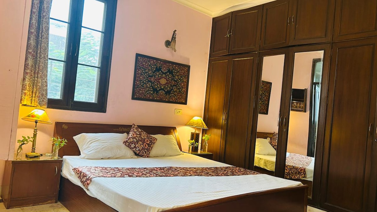 Centrally located in South Delhi's Safdarjung Enclave, this room is ideal whether you are a tourist or a business traveller. With all the latest amenities, the apartment is bound to make your stay comfortable.A stone's throw from Bhikaji metro station and one of Delhi's finest gardens-Deer park. Also in vicinity is the iconic eatery-Rajendra Ka Dhaba and R.K Khanna Tennis Stadium. Along with the pleasant time you will have, you'll also get a glimpse of the owner's unique treasures.