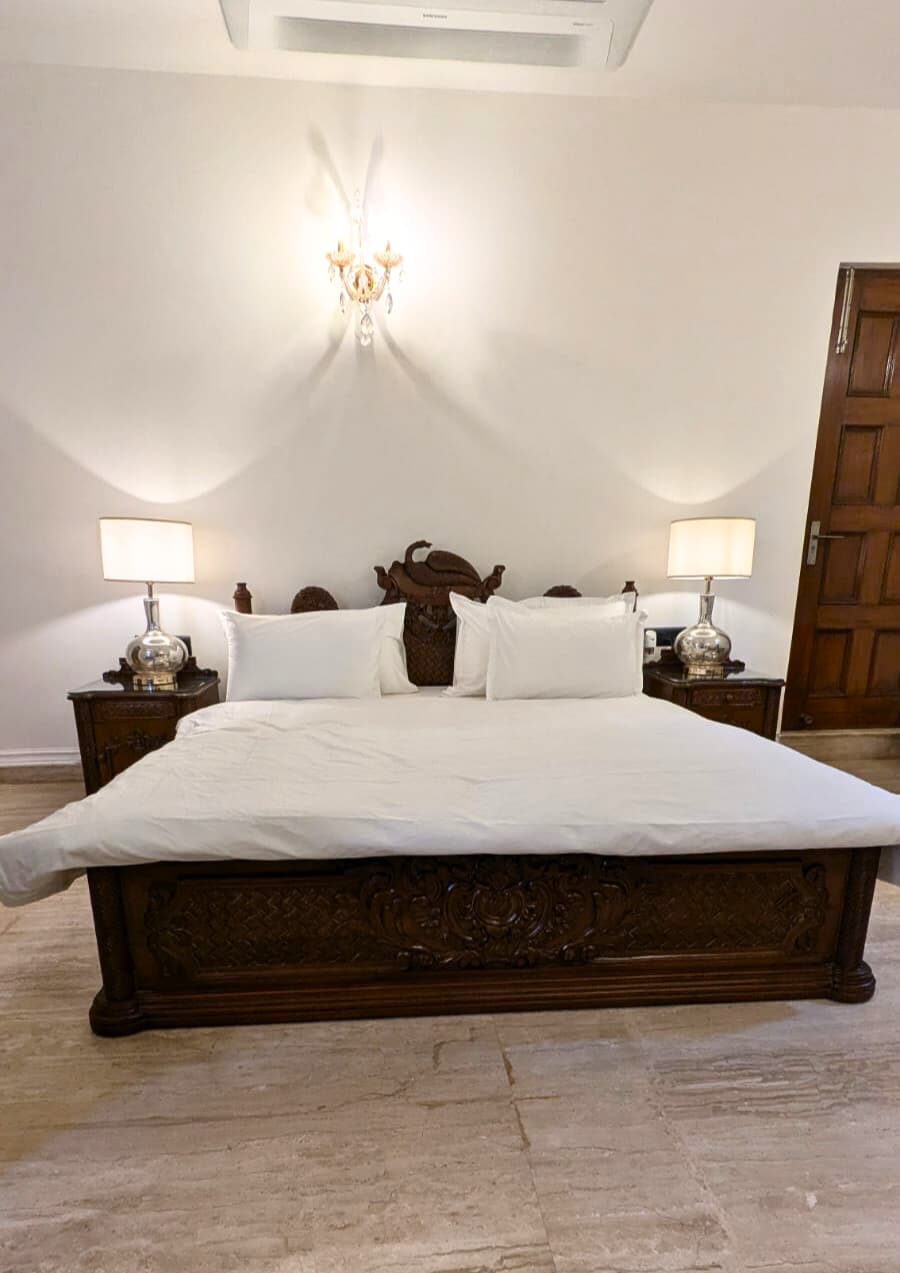 Attention: In peak season, place is booked very quickly! Experience unparalleled luxury in this exquisite South Delhi 3-bedroom floor in a house, in exclusive and gated Sainik Farms, located close to malls and Saket Metro Station. Bespoke Statuario Italian marble floors, hand-crafted furniture & spacious bedrooms with private balconies. Unwind in spa-like bathrooms with bathtubs, AI-based climate control, a fully equipped modular kitchen, and serene outdoor space.