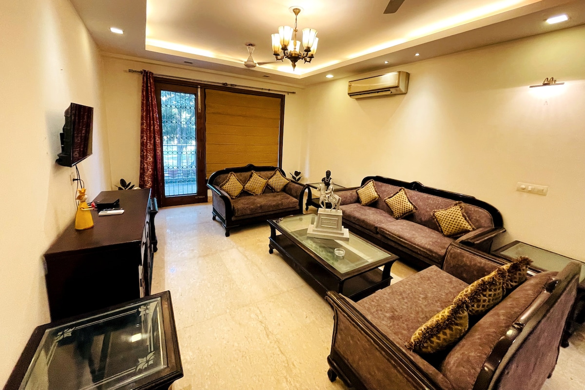 MES Secret Hide-out Bedroom with Lounge - is in the Heart of South Delhi-Gk1, with is a beautiful 1 BHK with a large bedroom having a 65inch TV and 2 x Sofa cum beds and an attached Toilet. A seperate Lounge room with Kitchen and a Sofa cum bed with TV. Also having a front Garden with seating and a nice Sunset view. Sleeping Capacity 4-7 Guests. Total area: 1000Sqft. Note: 7th April'25 checkin time 530pm