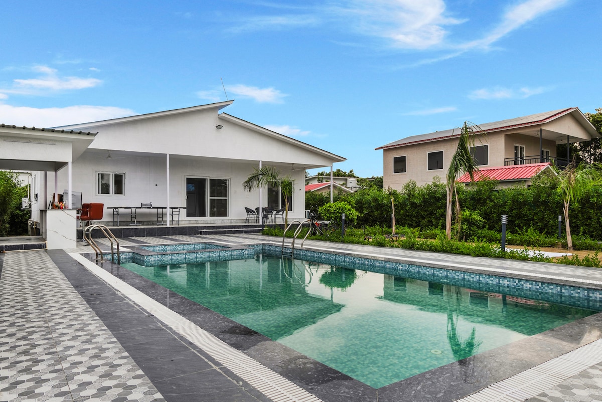 Framed by swaying palms & golden sunshine, this pet-friendly 3-BHK farmhouse is a serene retreat close to the most popular malls & restaurantsWith a private swimming pool, fairy-lit gazebo, & lush garden, it invites slow mornings & starlit eveningsInside, the spacious living room opens to soothing pool views, thoughtfully styled with warm, modern décorThe 3 bedrooms offer restful comfort with soft lighting & elegant finishes, creating a peaceful countryside retreat just minutes from the city