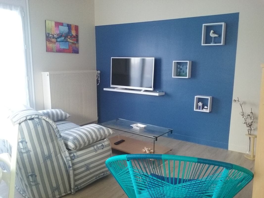 Appartement refait à neuf 4-6 personnes avec vue sur cour au rdc à 5 mn du centre et proximité de Pornic La Villa la Garenne est située à la Bernerie en Retz à 10 km de Pornic. Plusieurs appartements de 4 à 6 personnes avec un accès direct à la plage. Chaque appartement est constitué : - 2 ch (2 lits de 90 dans l’une et 2 lits superposés dans l’autre), oreillers et alèses fournis, - sde (douche, lavabo et WC) - pièce de vie : cuisine équipée, canapé lit et TV Linge fournis
