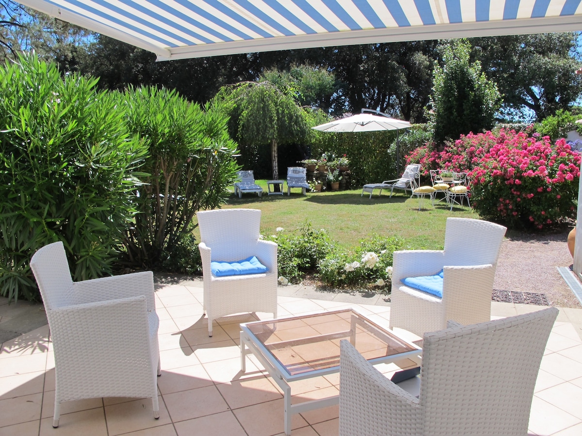 Beautiful house in a peaceful setting near La Clère beach (900m, 3 min by bike) and 5 min by bike from Plage des Dames and the town center. 4 bedrooms (three with double beds, one with 3 single beds), 3 bathrooms, a living/dining room, and a 2nd cozy living room. Outdoor shower for your return from the beach, two terraces, one a patio, plus a covered garden seating area with a barbecue (seasonal). Cleaning, linens and towels included. Electric car charging point available for an additional fee.