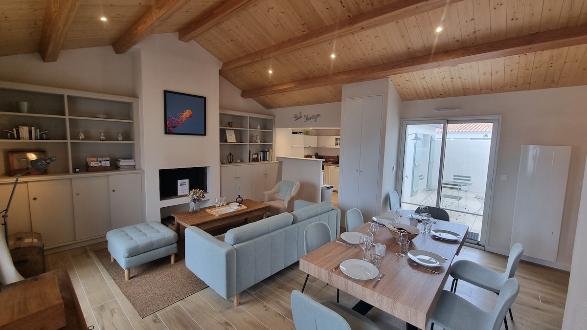 La Guérinière, maison neuve de 75m² au calme à 100m de la mer. Venez vous ressourcer dans cette maison familiale et cosy pouvant accueillir jusqu'à 6 personnes. La terrasse est exposée plein Sud avec barbecue et salon de jardin, le tout dans un espace clos, moments de détente garanties. A 100m de la plage de Mortrit, idéale pour la pêche à pied. Le bois des Éloux est à 5 minutes à pied. Commerces dans le centre de la Guérinière et de l'Épine à moins de 3 Km