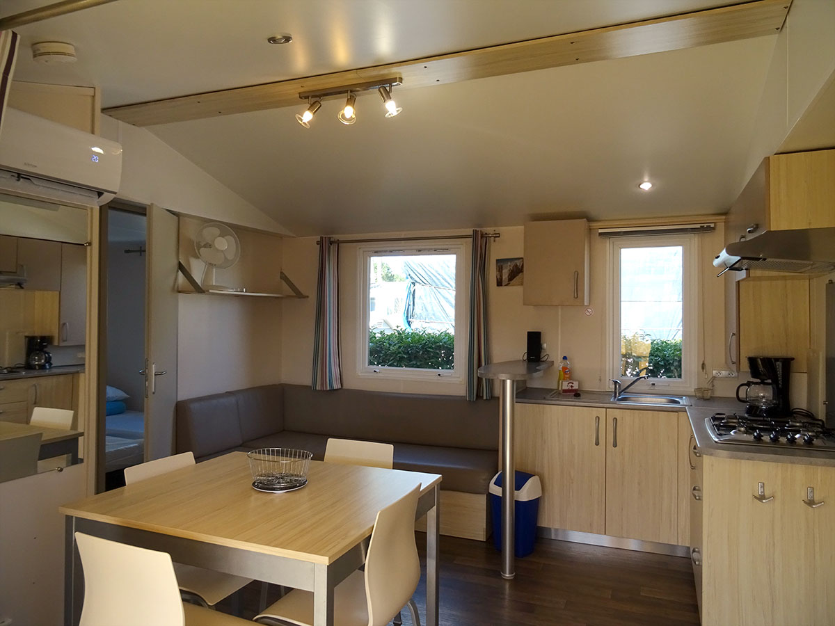 MOBIL-HOME confortable & cosy 40m2 au calme, VUE DEGAGEE devant et derrière CONTROLE ASSURE entre 2 locations, draps et serviettes jetables fournis LOCATION linge tissus SEJOUR CENTRAL , parties nuits aux extrémités 3 CHAMBRES, 1 lit double & 4 lits simples, 2 Salles d'eau & 2 WC CHAUFFAGE dans toutes les pièces, double vitrage, stores occultants et moustiquaires dans les chambres TERRASSE COUVERTE, parking privé ARRIVEE de 14 à 21 heures et départ 11 heures Sans SUPPLEMENT énergétique
