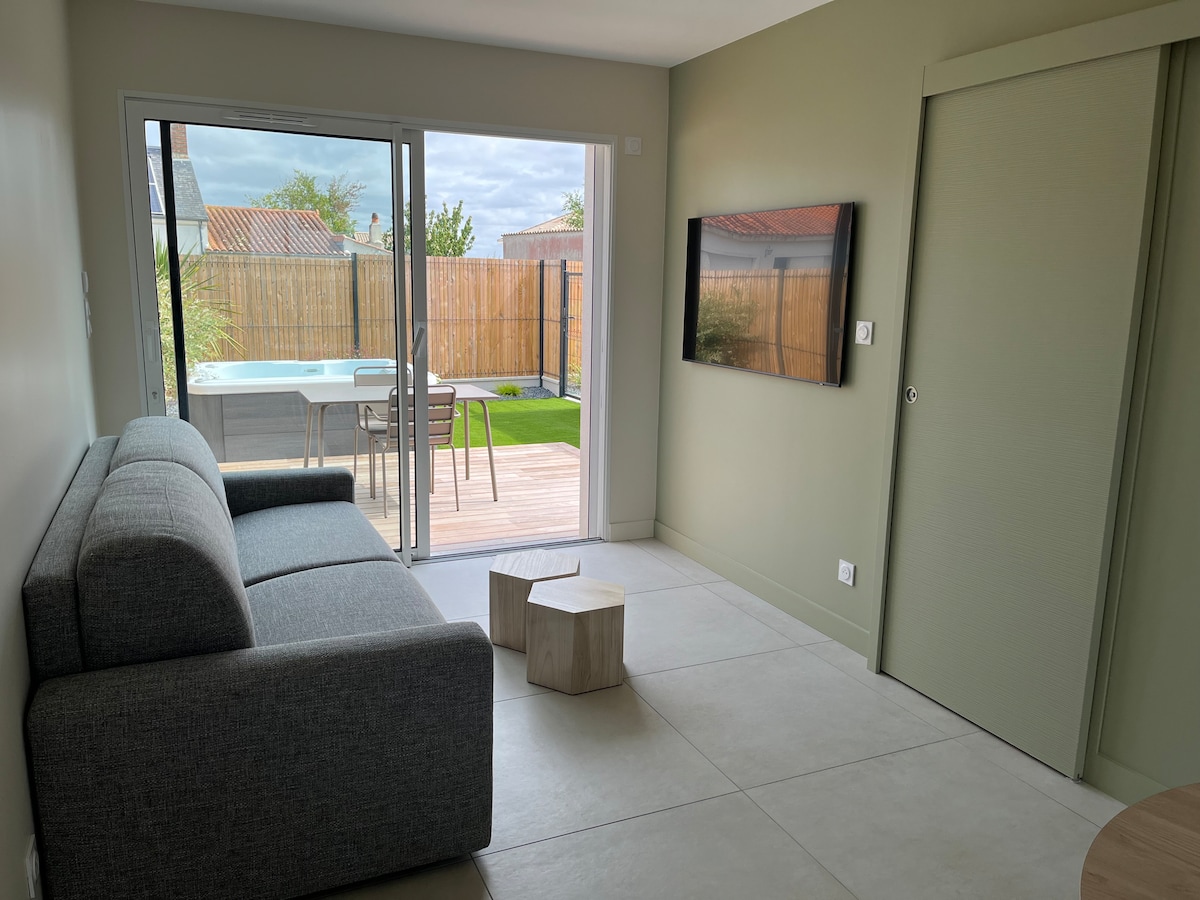 En plein cœur du charmant village de l’Epine sur l’île de Noirmoutier, à 30 mètres des commerces et 800 mètres de la plage. Logement composé d’une pièce de vie avec cuisine aménagée et équipée (machine Nespresso) et toute la vaisselle nécessaire. 2 chambres avec lits de 160, dressings (lit et chaise bébé sur demande). Salle de douche à l’italienne. Wc indépendant L’ensemble donne sur un jardin paysagé (exposition sud) avec terrasse. Un Spa canadien est à votre disposition