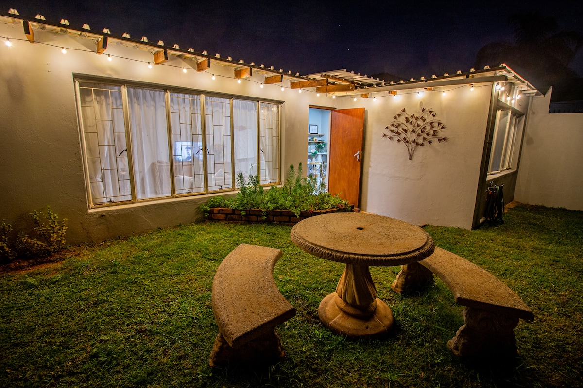 Enjoy a stylish experience in this centrally located space. Conveniently located 2 minutes from the highway and right next to Lynnwood Bridge and the CSIR. There is a queen sized bed, a small kitchen as well as an ensuite bathroom with a shower. The living area leads out onto a private patio with a weber. Bonus - Solar powered so no loadshedding! Come and enjoy our beautiful space and relax with your morning coffee under the trees as you listen to the birdsong around you.