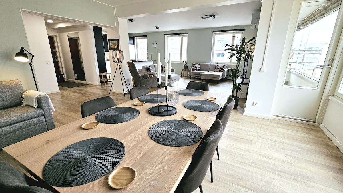 Enjoy the view over the city roofs! A beautifully furnished 68 m2 one-bedroom apartment in a 1921 build brick building. Fast Wifi, Tempur mattress and quality linen, 4K UltraHD TV, a kitchen with dishwasher and all the cookware necessary to make and enjoy a gourmet meal. A renovated bathroom with a washer dryer, a blow dryer, shampoo etc. 10 min walk from railway station, the central square and a forest.