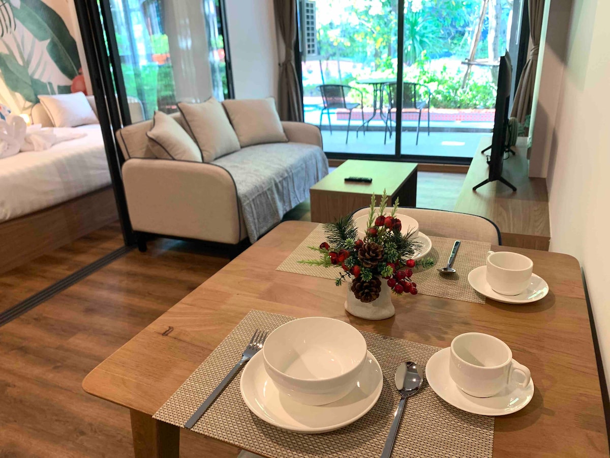 Welcome to a stylish newly built one bedroom condo. Fully furnished with modern luxury with pool view. The cozy bedroom prepare with fully comfort king bed mattress. The space offer a brand-new kitchen equipment. There are 2 smart TVs for living and bedroom. The room space is 50 sq.m. short walk to the beach, Cicada market and tamarind market. Many restaurants nearby. Wifi max speed with 300/300 mbps. Nespresso coffee machine provided. This room is perfect for your leisure or business.