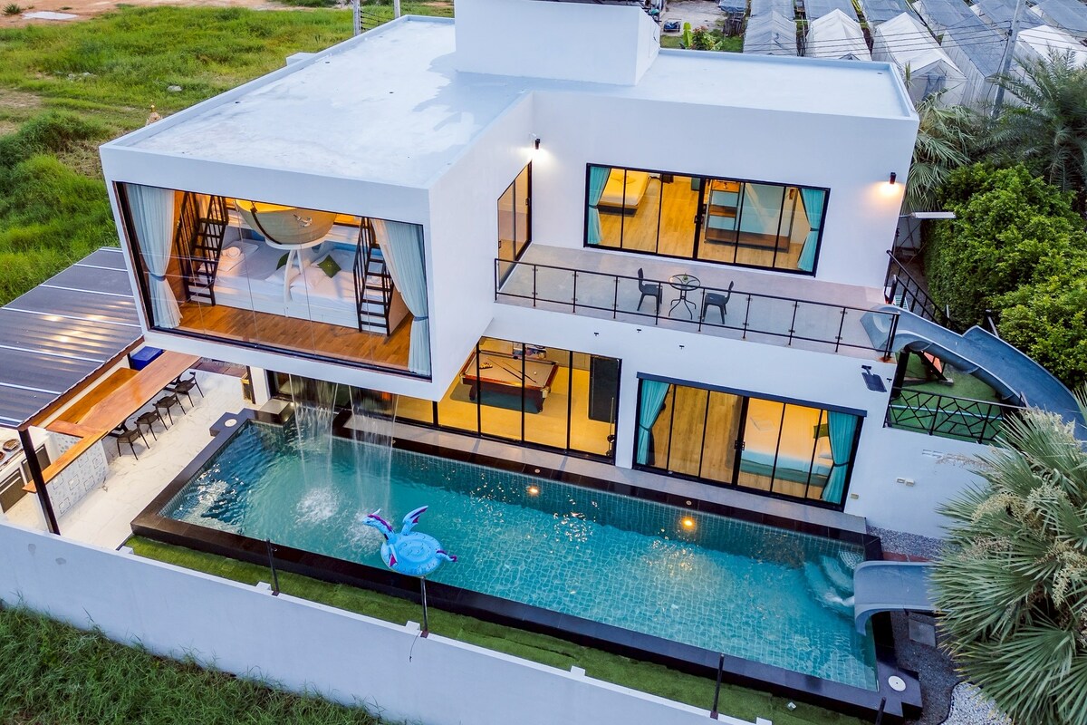 Relax with the whole family at this peaceful place to stay. Baan Pool Villa Dragon Hua Hin (Holiday home) - Vacation home - Private swimming pool - A relaxing and memorable holiday experience 4 Bedrooms | 4 Bathrooms | 1 Living Room | 1 Pool Table Accommodates up to 15 guests Extra: 1 Sofa Bed Amenities: Smart TVs with Netflix & YouTube Karaoke via YouTube Gas Stove BBQ Grill