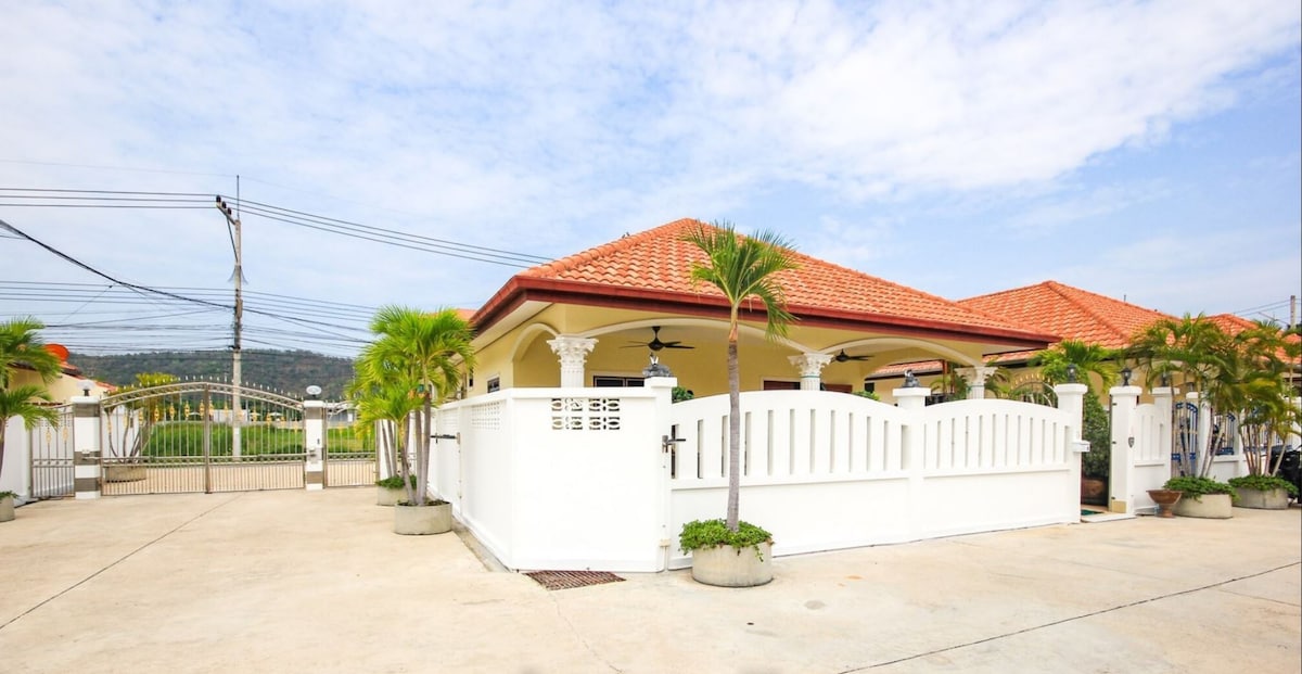 A new, romantic, cozy, clean & safe home, family- and office-friendly. Big Jacuzzi for 6 people!! Very convenient, full air-con, good mattresses, several shady terraces, BBQ possible, washing machine, hot water, Netflix ... It is placed in a relaxing and quiet village, just 5 to 10 minutes from … - town center - beautiful beaches - shopping malls - tourist attractions - hospitals Also check out our other 5-star holiday homes: airbnb.com/h/huahincityloft ... and: airbnb.com/h/city88home