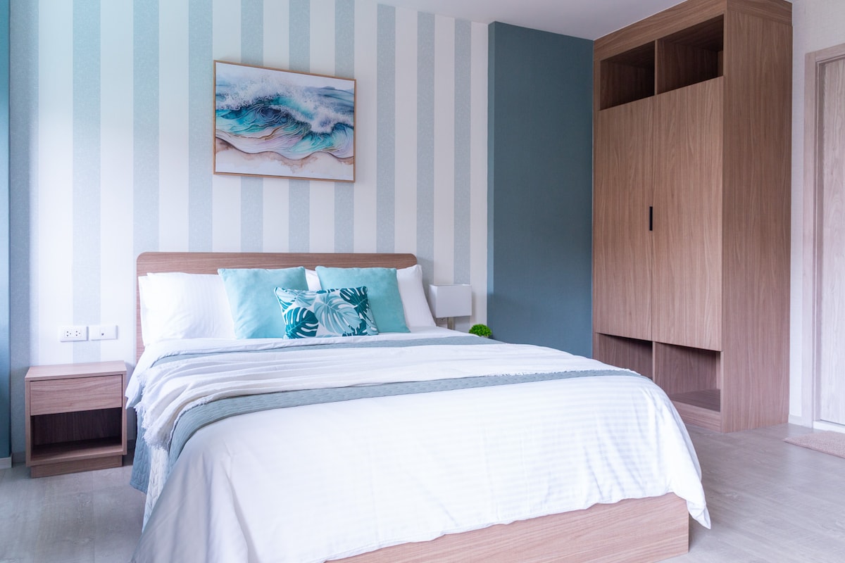 Double room with kitchen and balcony. On the 7th floor, quiet and offering the best sea view in the Lahabana Hua Hin condo. Just a 3-minute walk (100 meters) to the beach. Next to Cicada Market and Tamarind Market (Hua Hin's famous night markets). There's a large water park with water slides and a fitness center. Free access. High-speed Wi-Fi and washing machine inside the room - Check in 24 hours by yourself