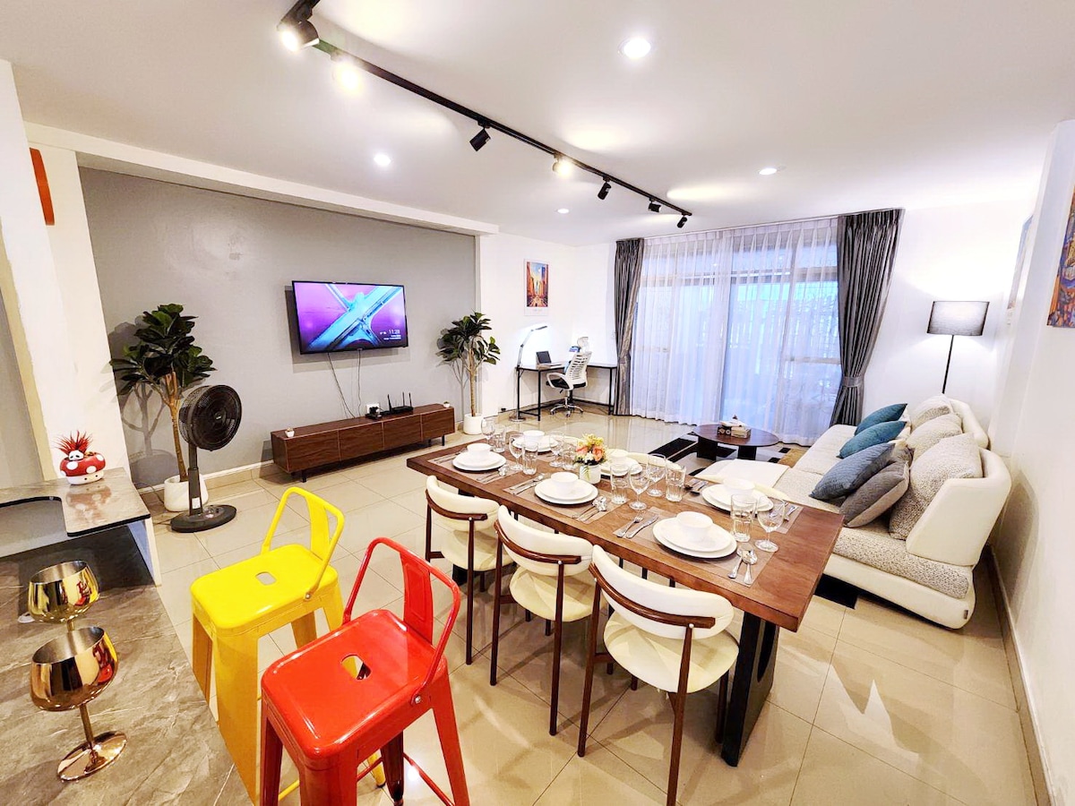 很荣幸被airbnb评为“超赞房东”,我会尽最大努力服务好每一位客人,airbnb上所有照片中设施均为真实拍摄。 🏠【房源介绍】 占地140平米的两层建筑,拥有3间独立卧室和2.5个卫生间,客厅,餐厅,封闭厨房。适合3-6人入住,适合亲子家属朋友旅行。在厨房空间,你将获得全套餐具,与亲朋好友一起烹饪美食。 该房源位于小区泳池的右侧。房屋有两层,两层房屋各有2.5个干湿分离的卫生间。房屋二层拥有三个臣室,一个主卧两个侧臣,共可以容纳6人居住。房屋配备无线网络以及无限网络电视,厨房配备厨具以及洗衣机。房屋门口便可无障碍停车。 小区出门200米有7-11便利店,便利生活非常快捷。并且可以使用Grab出行和点外卖。