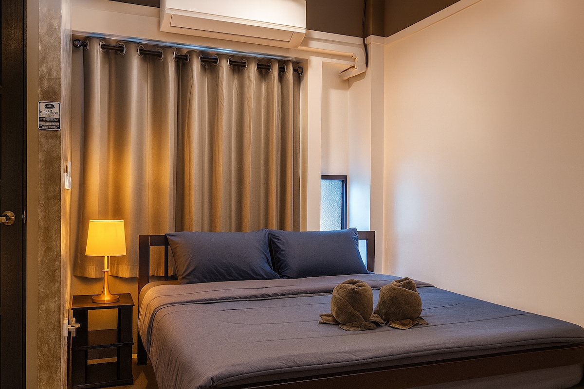 Our accommodation is a 52 square meter apartment. The common area has a beautiful saltwater swimming pool. There is 1 large bedroom with 1 king size bed, a living room for watching TV with a sofa and kitchenware with a 4-burner electric stove for heating and a room with a sunset view on the balcony. The living area has a smart TV and 2 air conditioners. There is free WiFi. Suitable for a family of 2-3 people and there is a private bathroom with a water heater