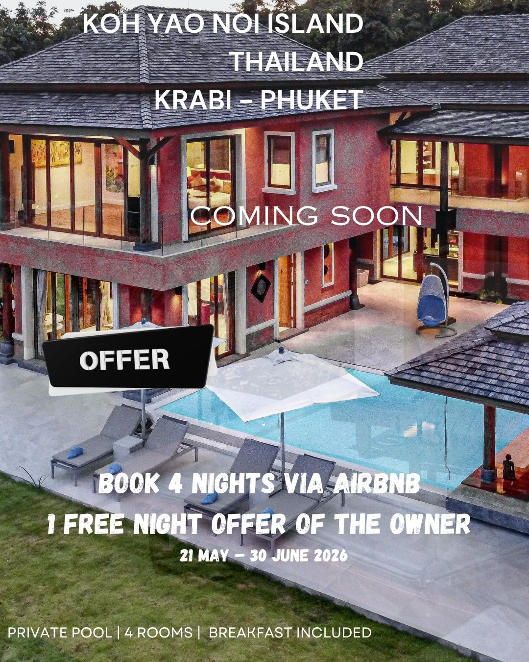 Private Pool Villas with Free Tuk-Tuk – 7 mins to Ao Nang Relax in your own private pool villa in a peaceful area of Ao Nang, just 7 minutes from the beach with our free tuk-tuk service — no need for scooters or taxis. Perfect for families and groups, each villa offers space, privacy, and a calm setting while staying close to restaurants, islands, and day trips. We are a boutique collection of 6 fully licensed villas, managed on-site by our friendly team to ensure a smooth, comfortable stay.