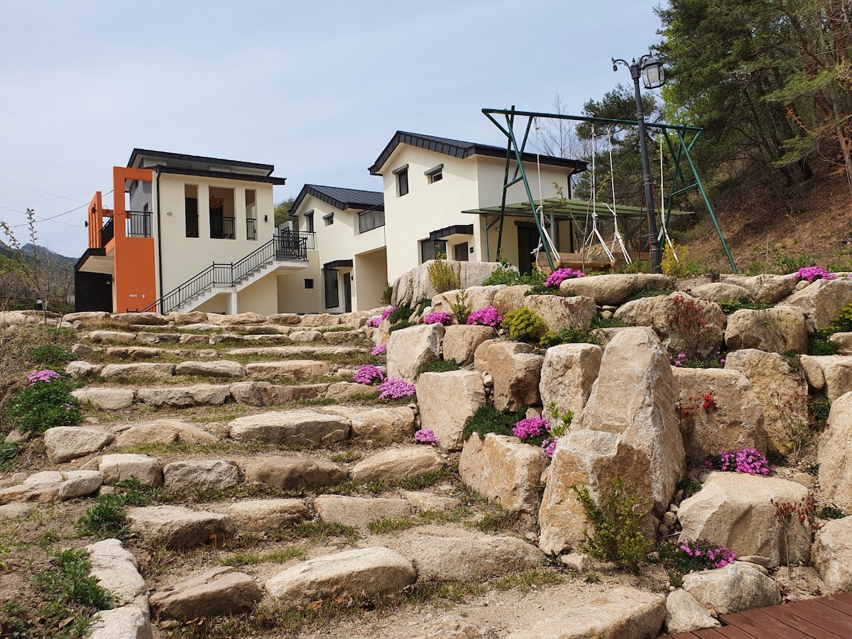 ⛰️가을에 방문하면 더 좋은 고즈넉이 하우스⛰️ 산 속에 위치하여 가을에 방문하기 좋은 독채입니다~ 독채 단독 사용이니 조용하고 한적한 곳에서 데이트&모임을 여유롭게 즐기실 수 있습니다❤️ 거실 및 안방에 각각 에어컨 구비로 쾌적한 실내 공간 제공👍 모임의 경우 4인까지 수용 가능하니 호스트에게 사전 문의 꼭!! 부탁드립니다🙂 가을이면 더욱 아름다워지는 고즈넉이 하우스와 즐거운 가을 바캉스 즐기세요^__^🍂 -------------------------------------------------------------- 넓은 잔디밭과 푸르른 산으로 둘러싸여 자연친화적인 나무집입니다. 정겨움과 여유로움이 있는 고즈넉한 하우스입니다. 반려동물 동반 가능하며 독채 단독 사용입니다. 숙박인원은 2명기준이나 사전에 문의 주시면 4인까지 수용 가능합니다. 꼭 메세지 주세요! 화로와 함께 불멍을 하며, 시골에서 편안한 하루~~~ (*숙소의 정확한 주소는 호스트에게 꼭 문의해주세요)