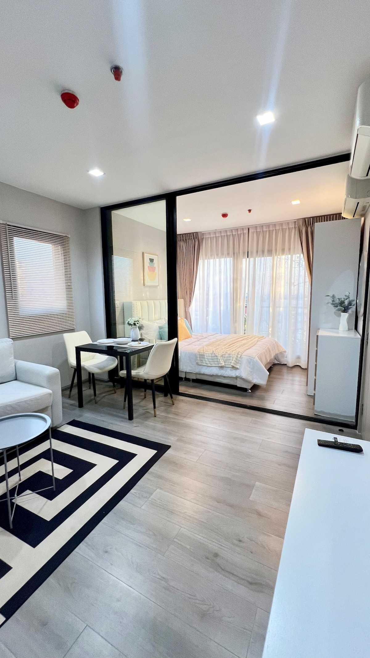 1 ห้องใหญ่ ห้องรับแขกและห้องนอน มีพื้นที่ใช้สอย วิวสวย บรรยากาศดีมาก เหมาะกับการพักผ่อนหรือมาสัมนาประชุม สะดวกกับที่จอดรถ ขนาดห้องกว้าง 34 ตรม. สิ่งอำนวยความสะดวกครบครัน ตู้เย็น เครื่องทำน้ำอุ่น กาน้ำร้อน ไมโครเวฟ ทีวี ห้องนั่งเล่น แอร์ 2 ตัว You have swimming pool, close to 7-eleven, Don Mueang International Airport, so many shops! as medical clinic, Mali Market for some REAL thai shopping experience, Impact Arena for big events & trades shows, good coffee shop; Bon A Blissx, Central Mall, and koh kret island for pottery class! Free wifi